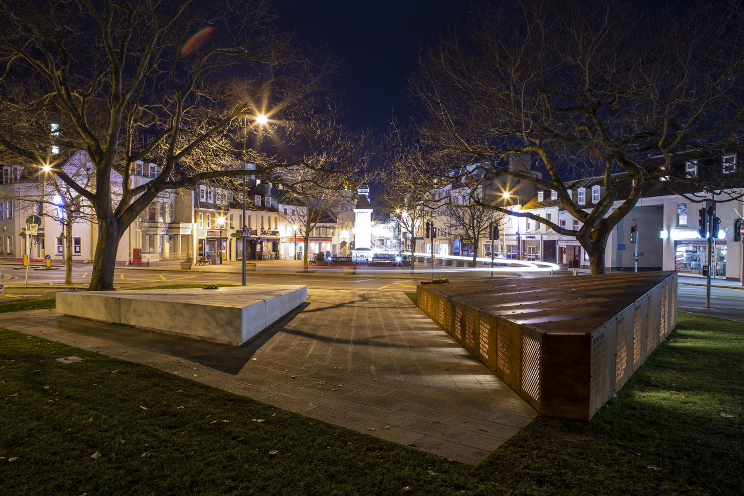 The memorial is ever changing, the Core 10 metal will age over time, intentionally, the stone piece is lit from underneath as if buoyant with a sense of hope, in contrast the metal structure   is lit from within, perpetuating the lives shining on in memory forever.