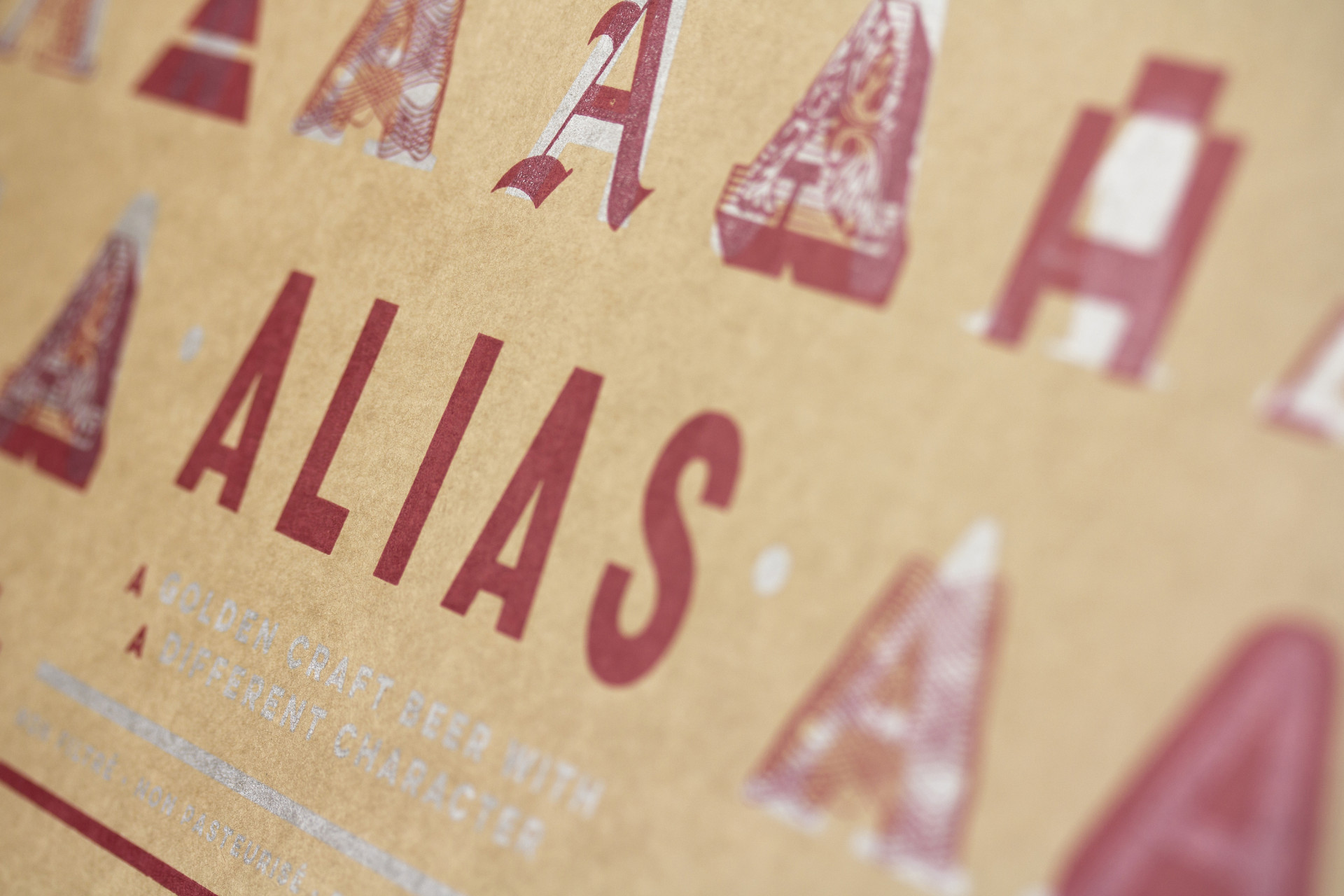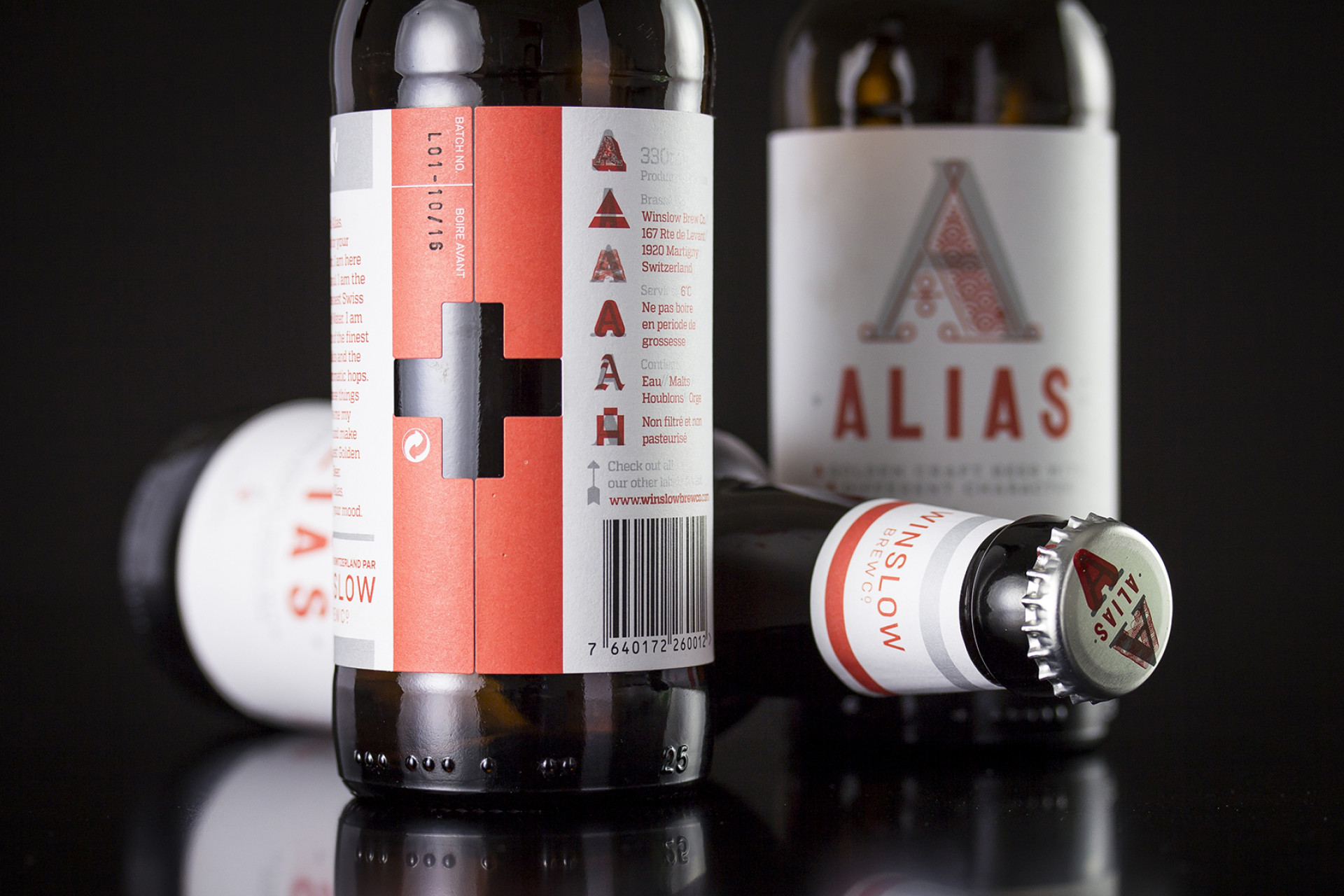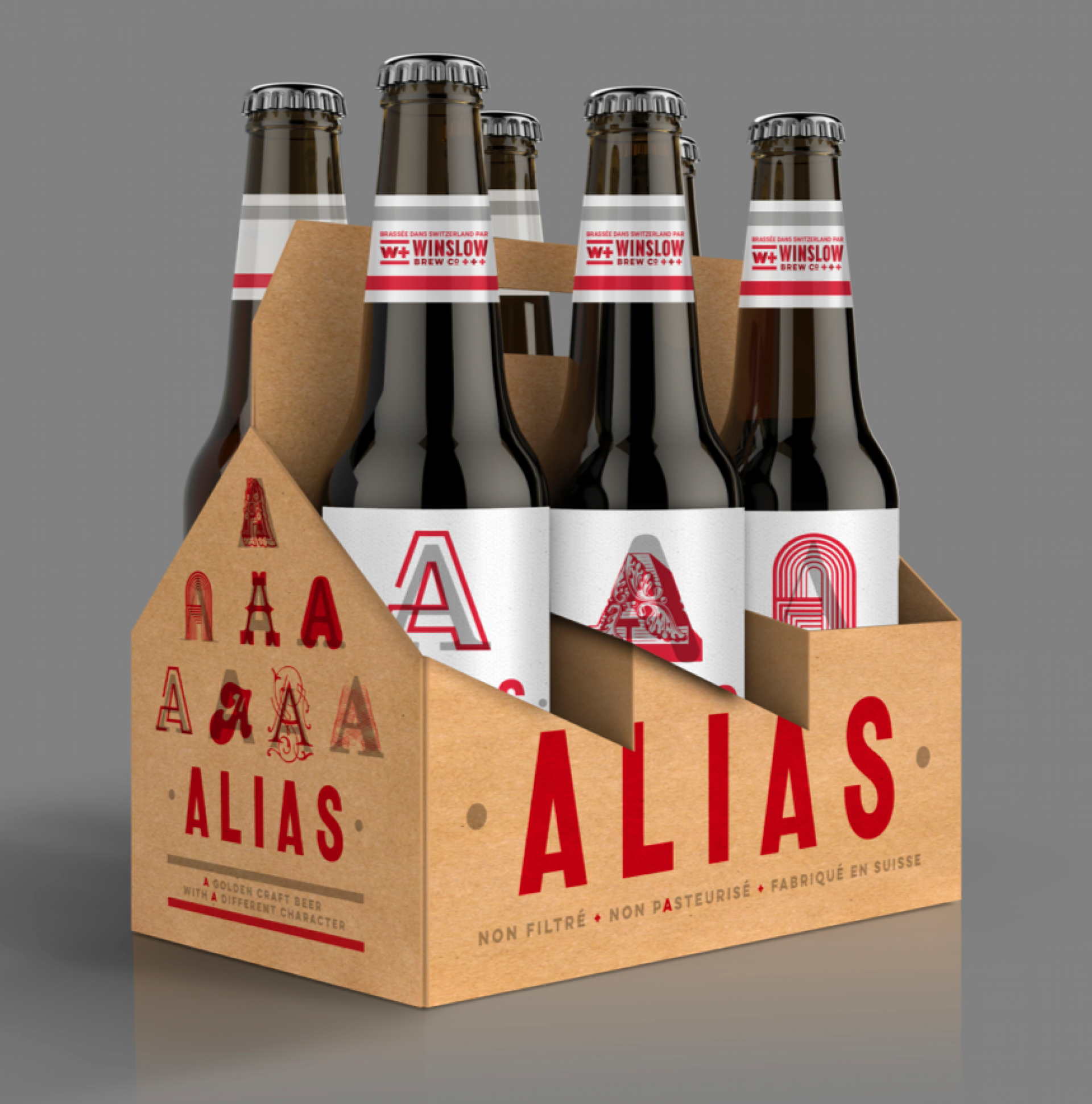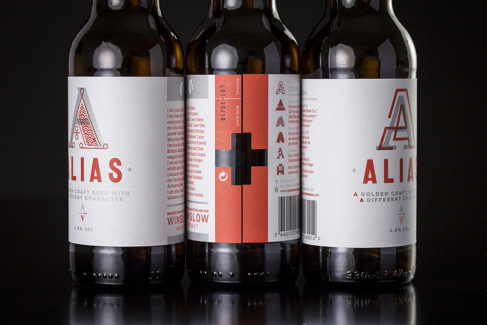First came the Winslow Brew Co. brand. The brand G chose was the one closest to his roots in Switzerland and is an echo of the cultural flag of his area – Valaisanne. Then came the brand for his first brew… Alias. The more we delved into the name idea the further we explored the notion of character, in terms of flavour, in terms of ‘type’ and in terms of personality. This resonated with us instantly and became the foundation for our creative path. We presented 3 options of differing brand temperatures and what you see here is the live chosen brand. The silver, whilst still beautiful, is the more conservative ‘you’, the opaque red over the top is your vibrant ‘alias’. These characters echo both the flavour and the sentiment of the product and produce an extensive brand proposition and language which translates culturally and commercially.