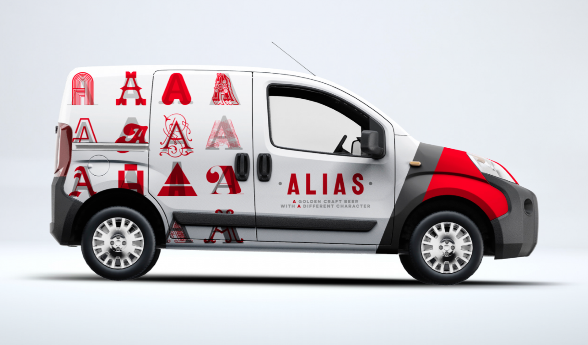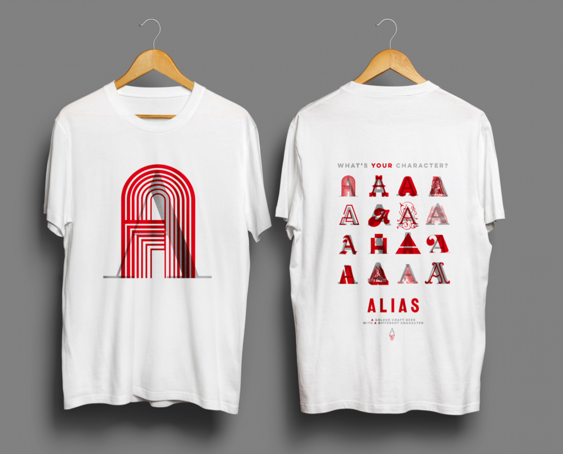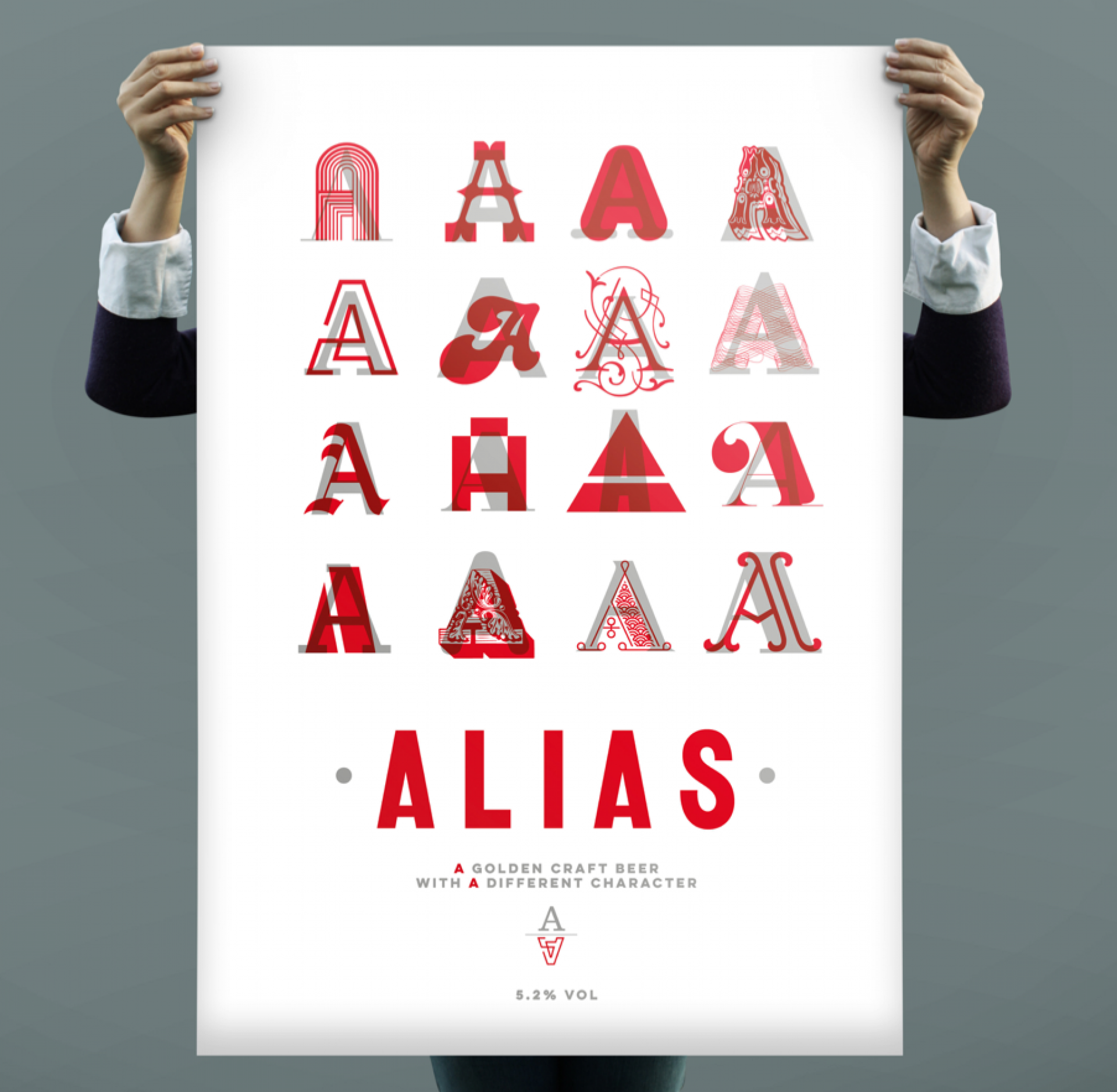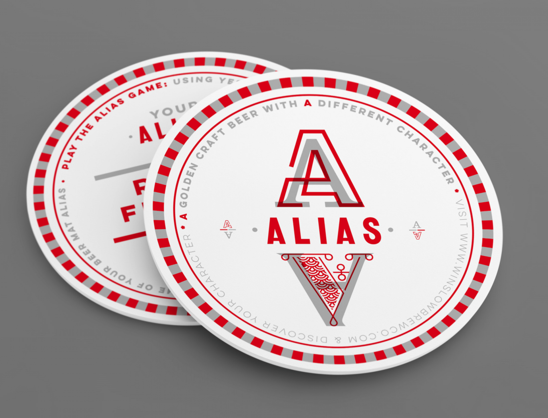 First came the Winslow Brew Co. brand. The brand G chose was the one closest to his roots in Switzerland and is an echo of the cultural flag of his area – Valaisanne. Then came the brand for his first brew… Alias. The more we delved into the name idea the further we explored the notion of character, in terms of flavour, in terms of ‘type’ and in terms of personality. This resonated with us instantly and became the foundation for our creative path. We presented 3 options of differing brand temperatures and what you see here is the live chosen brand. The silver, whilst still beautiful, is the more conservative ‘you’, the opaque red over the top is your vibrant ‘alias’. These characters echo both the flavour and the sentiment of the product and produce an extensive brand proposition and language which translates culturally and commercially.